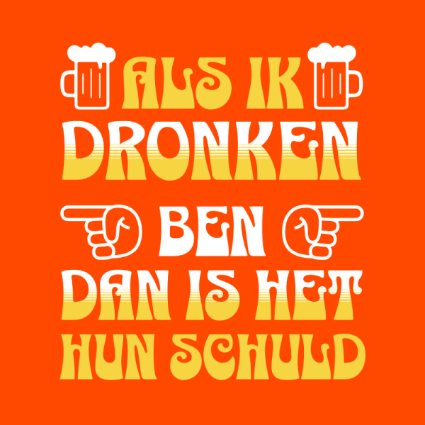Oranje hoodie met grappige tekst: Als ik dronken ben dan is het hun schuld. Deze comfortabele hoodie is een uniseks model en is verkrijgbaar in de maten XS t/m 4XL. Bekijk de maattabel onderaan de pagina voor de juiste maat.