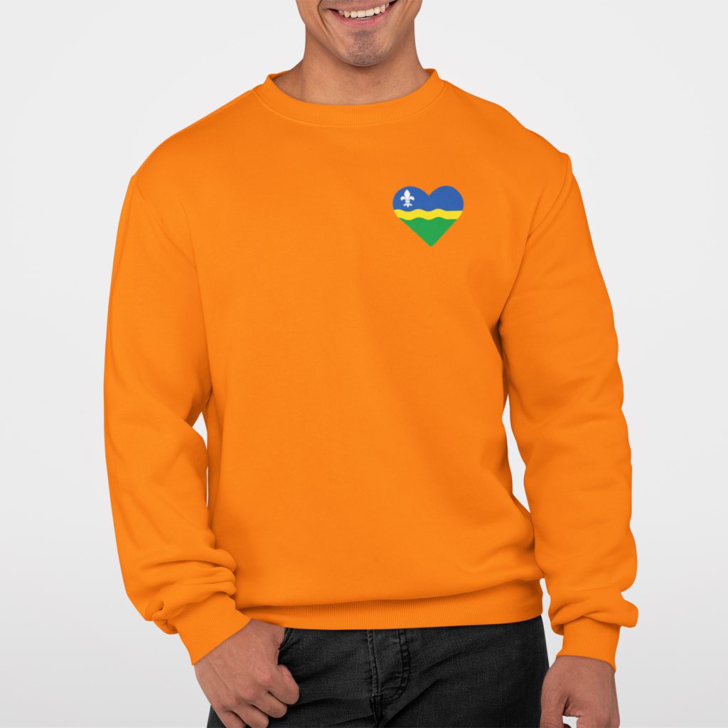 Vier jij Koningsdag in de polder? Deze oranje Flevoland sweater is de perfecte keuze voor een frisse 27 april. Geen grote opdrukken, maar een verfijnd en klein hartje met de kleuren van de Flevolandse vlag op de borst. Zo combineer je de nationale feestdag subtiel met jouw eigen provincie.