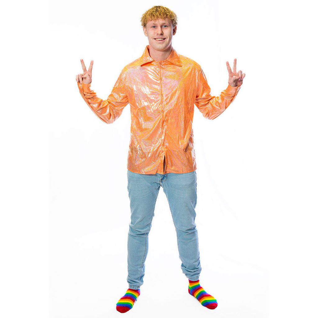 Deze oranje disco glitter blouse is perfect voor een 70’s avond of feestje maar kan ook gebruikt worden met Koningsdag! De blouse is geschikt voor heren en is gemaakt van 100% polyester met een satijnen look. Extra leuk om te dragen met carnaval of een themafeestje. Met deze party blouse maak je jouw feestoutfit helemaal af!
