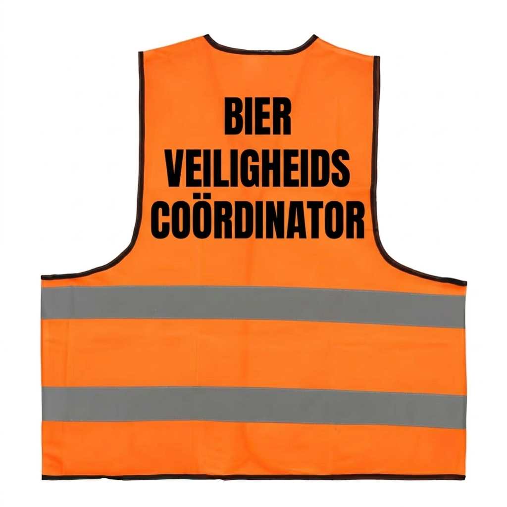Veiligheidshesje voor carnaval met de tekst Bier Veiligheidscoördinator. Uiteraard mag je dit hesje alleen maar dragen als je afgestudeerd bent in de bierkunde! Het heeft twee reflecterende strepen van 5 cm breed en een klittenband bevestiging. Speciaal voor de beste zichtbaarheid en optimaal draagcomfort!