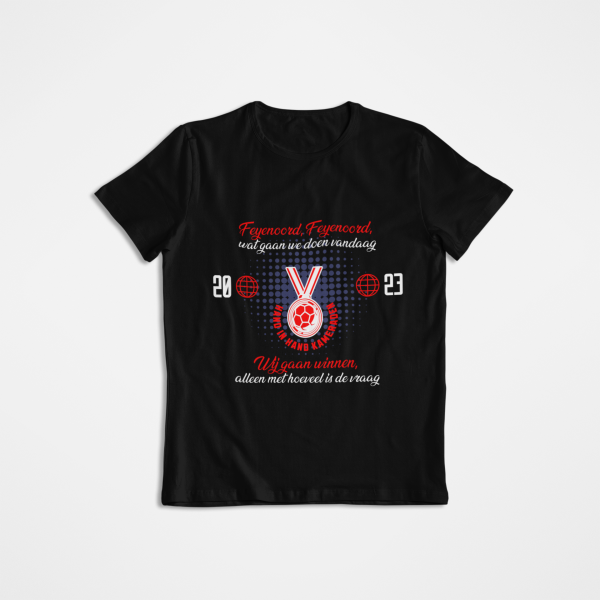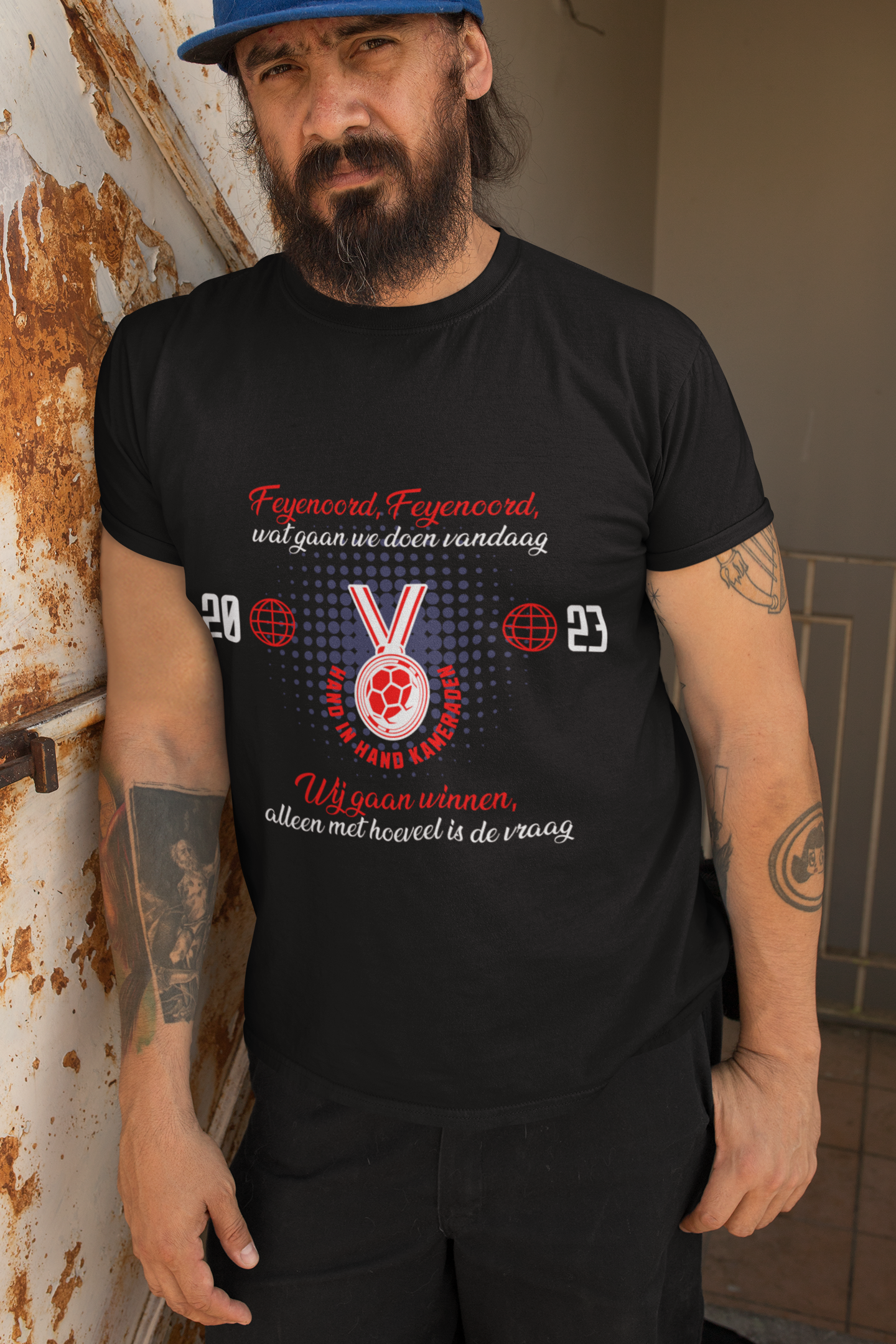 Laat zien hoe trots je bent op onze club met dit zwarte T-shirt met print Wat gaan we doen vandaag? Wij gaan winnen! Fijn model heren T-shirt is leverbaar zwart in de maten XS t/m 5XL.